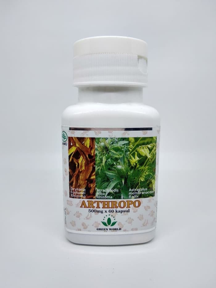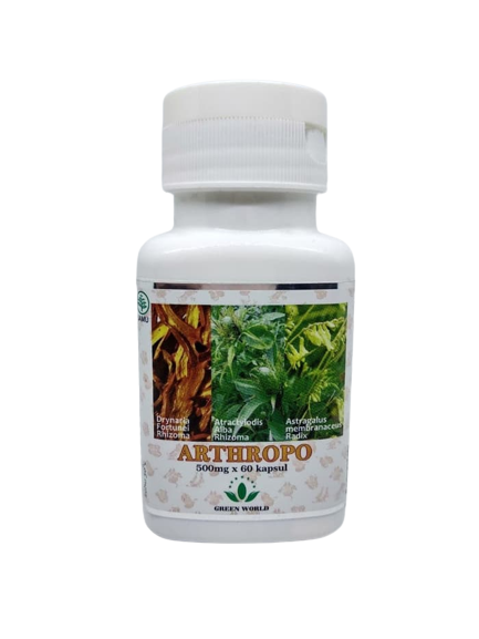 Green World Arthropo Capsule dibuat dari hasil riset terkini, memberikan hasil nyata dalam melindungi persendian, menghilangkan radang sendi dan radang otot. Produk ini terbuat dari 100% bahan herbal alami khusus yang mampu mengatasi masalah tulang dan sendi Anda secara alami tanpa efek samping. Suplemen ini mengandung bahan alami racikan tabib ahli dari tiongkok seperti Kalsium karbonat, Drynaria rhizome, dan Ekstrak astragalus mongholicus yang telah teruji dan terbukti dalam mengatasi masalah tulang dan sendi.
